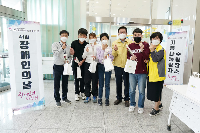 유덕열 서울 동대문구청장은 20일 장애인의 날을 맞아 지역내 다사랑행복센터 및 동문장애인복지관을 방문했다. 구는 복지관 방문 장애인들에게 장미꽃과 간식세트를 전달하고, 기관에 마스크 총 2500개·손소독제 80개를 전달했다. 사진은 이날 유덕열 구청장(오른쪽 세 번째)이 장애인들과 기념촬영을 하는 모습. (사진제공=동대문구청)