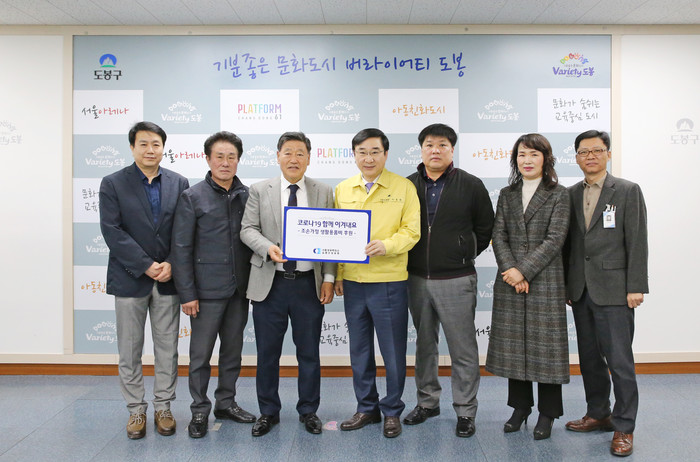 서울 도봉구는 최근 도봉구상공회로부터 코로나19 극복을 위한 조손가정 후원 성금 800만원을 전달받았다. 전달받은 성금은 지역내 8개 조손가정의 생활용품비로 지원될 예정이다. 사진은 이동진 구청장(가운데)과 관계자가 기념촬영을 하는 모습. (사진제공=도봉구청)