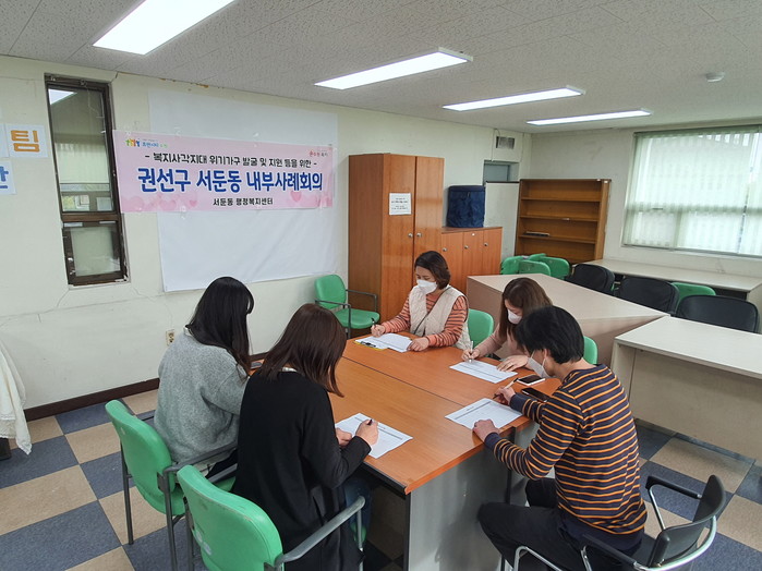 경기 수원시 권선구 서둔동은 최근 제3차 내부사례회의를 열고 치아치료가 필요한 만 65세 미만 기초생활수급자 가구의 민간 의료비지원 사업 연계 및 척추질환 홀몸노인 가구의 건강관리 및 식사지원 등 추후 연계방향에 대해 논의했다. 사진은 회의가 진행되고 있는 모습. (사진제공=권선구청)