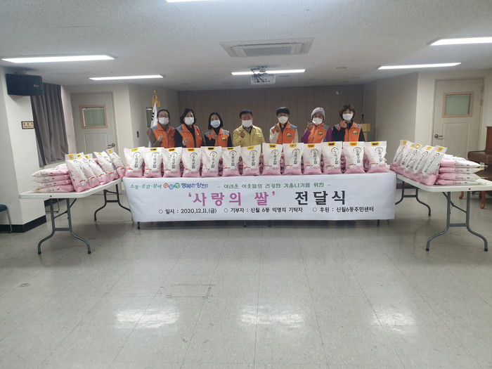 서울 양천구 신월1동 주민센터는 최근 (주)신길운수로부터 지역내 소외계층의 겨울나기를 위한 20kg 쌀 20포를 기부받았고, 신월6동에서는 익명의 독지가로부터 사랑의 쌀 5kg 200포를 기부받았다. 사진은 신월6동 쌀 나눔 행사에서 관계자들이 기념촬영을 하고 있는 모습. (사진제공=양천구청)