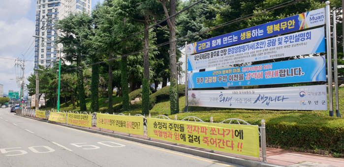 | ▲ 무안군청 입구에 무안군민들이 자신들의 주장을 알리는 현수막 장면(사진=황승순 기자) |