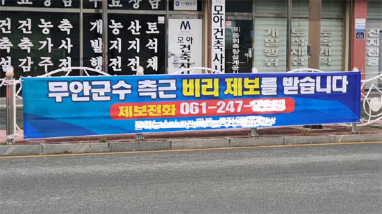 | ▲ 무안군청 정문 앞 도로변에 설치된 '군수측근 비리제보' 현수막 |