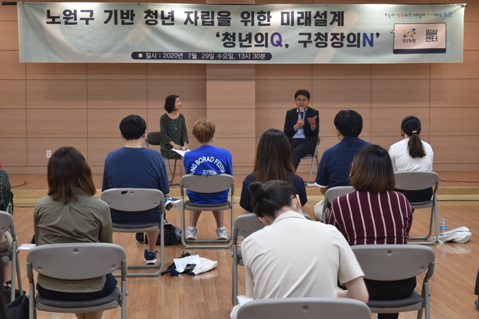 오승록 서울 노원구청장은 29일 상계2동 주민센터에서 열린 청년 일경험센터의 일경험 워크파티에 참석했다. 이 행사는 일경험센터 사업에 참여하고 있는 청년들과 소통하고 대안을 모색하고자 개최됐다. 사진은 일경험 워크파티에서 오 구청장(오른쪽)이 청년들과 대담을 하고 있는 모습. (사진제공=노원구청)