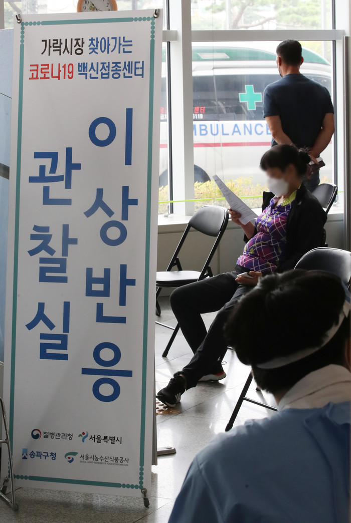 30일 서울 송파구 가락시장에 설치된 '찾아가는 코로나19 백신접종센터'에서 상인들이 얀센 백신을 접종받은 뒤 이상반응을 살피기 위해 대기하고 있다.