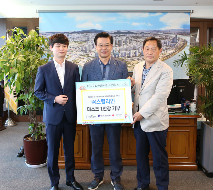 서울 용산복지재단이 21일 사이버 보안 기업 스틸리언으로부터 코로나19로 어려움을 겪고 있는 취약계층을 위한 마스크 1만매를 기부 받았다. 전달된 마스크는 지역내 노인복지시설 6곳에 배부될 예정이다. 사진은 성장현 구청장(가운데)과 관계자들의 기념촬영 모습. (사진제공=용산구청)