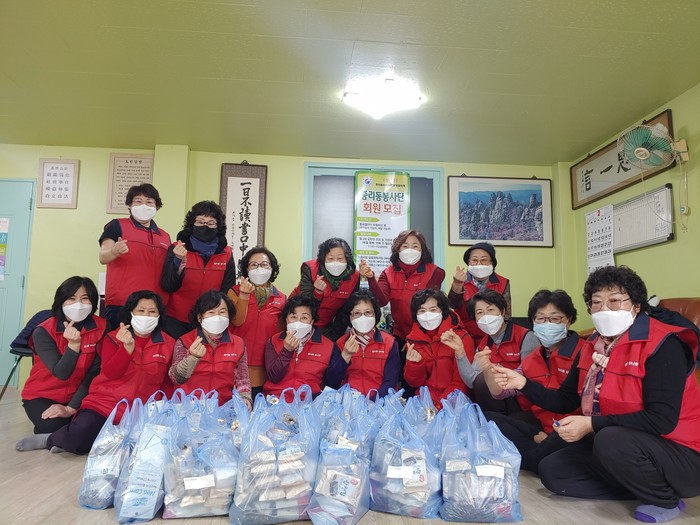 경기 이천시 중리동 자원봉사단이 지난 10일 지역내 취약계층을 위한 '사랑의 밑반찬 배달봉사'를 펼쳤다. 이날 10여명의 회원은 지역내 저소득 홀몸노인 등 41가구에 떡, 마른반찬, 마스크 등을 전달했다. 사진은 회원들의 기념촬영 모습. (사진제공=이천시청)