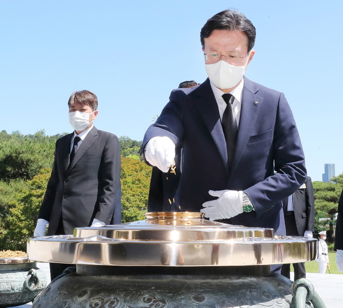 채현일 영등포구청장은 호국보훈의 달 첫째 날인 1일, 9개 보훈단체 지회장들과 국립서울현충원을 함께 방문하며 역사를 돌아보는 뜻깊은 시간을 보냈다. 사진은 채 구청장이 호국영령을 기리기 위해 분향하고 있는 모습. (사진제공=영등포구청)