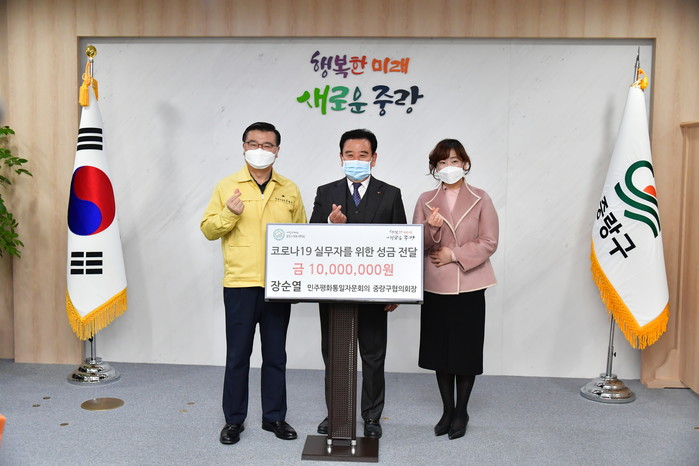 서울 중랑구는 최근 장순열 민주평화통일자문회의 중랑구협의회장으로부터 코로나19 관련 실무자 지원을 위한 성금 1000만원을 전달받았다. 사진은 전달식에 참석한 류경기 구청장(왼쪽)이 장 회장과 기념촬영을 하는 모습. (사진제공=중랑구청)