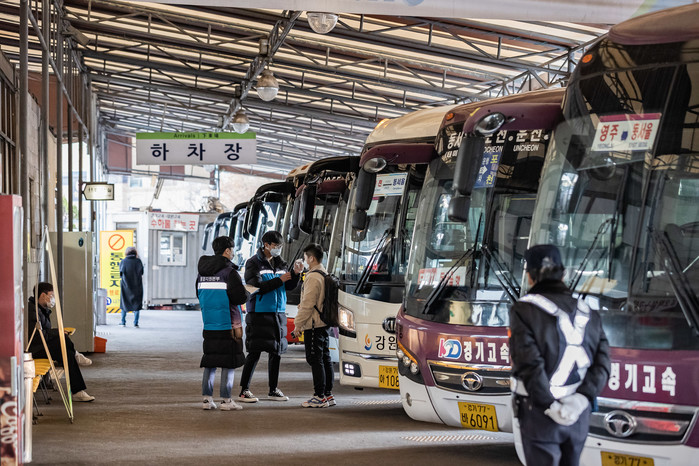 광진구가 코로나19 지역감염 확산을 막기 위해 지난 5일부터 동서울터미널에서 하차객을 대상으로 체온측정을 실시하고 있다. 운영은 매일 오전 8시~오후 10시 구청직원과 자원봉사자, 동서울터미널 관계자를 5명씩 2교대로 배치하고, 동서울터미널 하차장에 승객이 내리면 한 명씩 열을 확인하는 방식으로 진행된다. 사진은 구청 관계자가 하차객을 대상으로 체온 측정을 하고 있는 모습. (사진제공=광진구청)