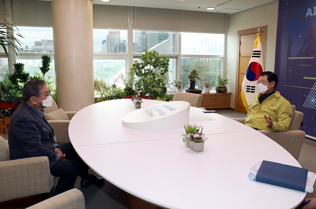 | ▲ 이용섭 광주광역시장이 2일 오전 시청 접견실에서 행정통합 특강에 앞서 김태일 대구경북행정통합공론화위원회 공동위원장과 환담을 하고 있다. 김 위원장은 이날 '지방정부의 초광역화 전략 의미와 과제'라는 주제로 강연을 했다./광주광역시 제공 |