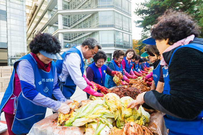 5일 서울 광진구 시설관리공단 광장에서는 바르게살기운동 광진구협의회가 주관하는 ‘어려운 이웃 김장 담가드리기’ 행사가 열렸다. 사진은 행사에 참석한 김선갑 구청장과 주민들이 김장을 하고 있는 모습. (사진제공=광진구청)