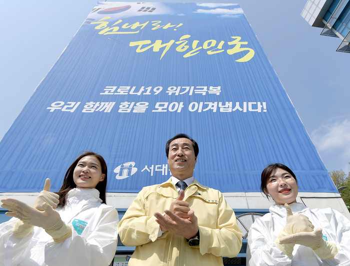 문석진 서대문구청장이 최근 구청 과장에서 '존경'의 의미를 가진 수어 동작으로 코로나19 환자 진료에 힘쓰고 있는 의료진을 응원하는 '덕분에 챌린지'에 동참했다. 사진은 문 구청장(가운데)이 직원들과 함께 덕분에 챌린지 수어 동작을 하고 있는 모습. (사진제공=서대문구청)
