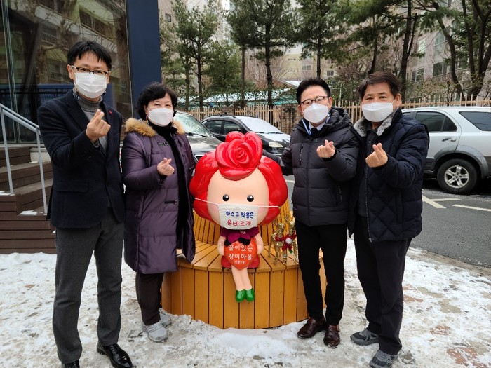 서울 광진구 자양3동 주민센터는 11일 주민자치위원회 위원 및 동 자원봉사캠프 봉사자들과 함께 대형 마스크를 직접 제작해 주민센터 앞에 설치된 장미 캐릭터 조형물에 마스크를 씌웠다. 사진은 관계자들이 조형물 옆에서 기념촬영을 하는 모습. (사진제공=광진구청)