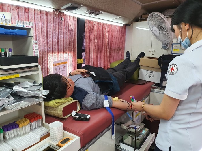 경기 오산시는 11일 신종 코로나바이러스 감염증(우한폐렴) 확산에 따른 혈액 부족사태를 해소하고자 ‘공직자 사랑의 헌혈 운동’을 실시했다. 이날 공직자 및 시민 50여명이 참여해 헌혈에 참여했다. 사진은 헌혈을 하는 모습. (사진제공=오산시청)