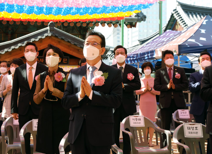 정순균 서울 강남구청장이 19일 부처님 오신날을 맞아 지역내 봉은사·법룡사를 방문해 봉축법요식에 참석했으며 불교계의 코로나 방역지침 협조에 대한 감사를 전했다. 사진은 봉은사에서 정 구청장(앞쪽)이 봉축법요식에 참여하고 있는 모습. (사진제공=강남구청)