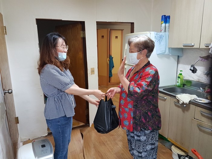 경기 수원시 팔달구 화서2동 지역사회보장협의체는 29일 지역내 저소득층 홀몸노인 20여명을 위해 ‘화사한 반찬 나눔’ 행사를 진행했다. 사진은 협의체 관계자가 노인에게 반찬을 전달하는 모습. (사진제공=팔달구청)