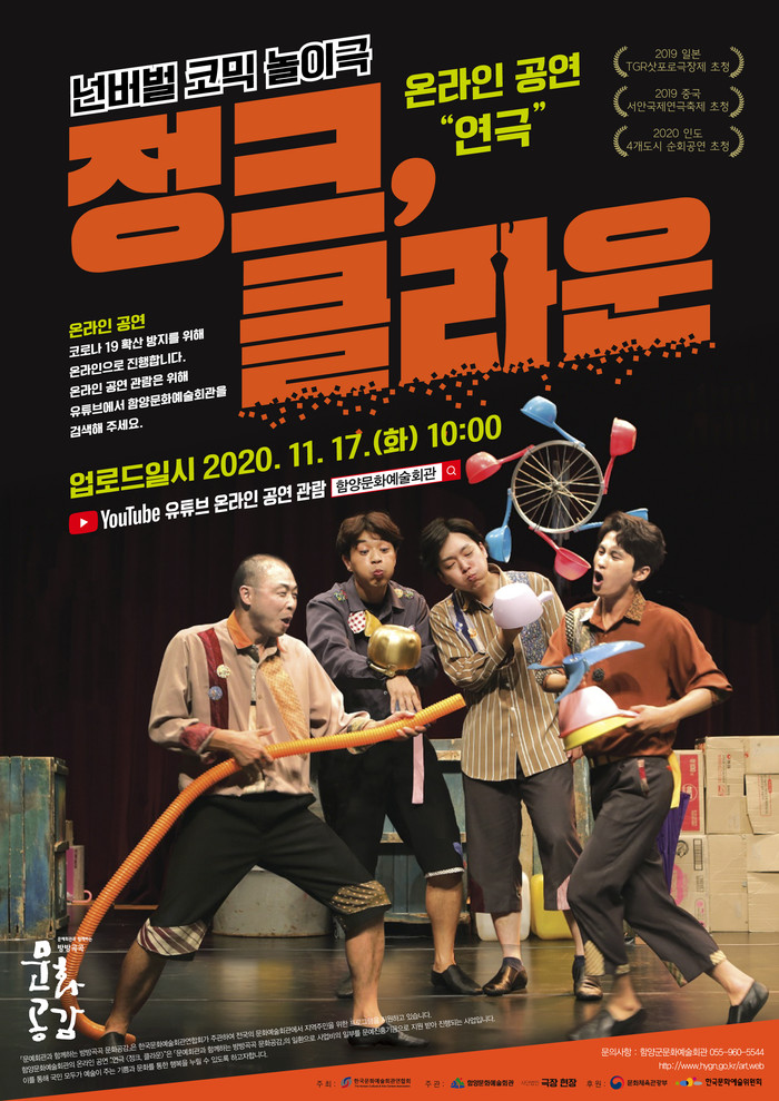 이번 공연은 광대(Clown)들의 코믹캐릭터가 어우러진 ‘넌버벌 코믹 마임극’으로 남녀노소 누구나 유쾌하게 즐길 수 있는 공연 오는 17일 오전 10시부터 유튜브에서 ‘함양군문화예술회관’을 검색하여 게시된 작품 동영상 시청이 가능하다.