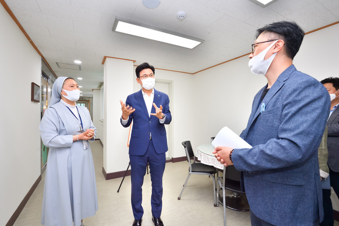 송파구는 오는 10일까지 ‘현장방문 주간’을 운영한다. 분야별 역점사업 현장을 구청장이 직접 찾아 주민과 만난다. 사진은 박성수 구청장(가운데)이 잠실종합사회복지관 방문해 관계자와 이야기를 나누고 있는 모습. (사진제공=송파구청)