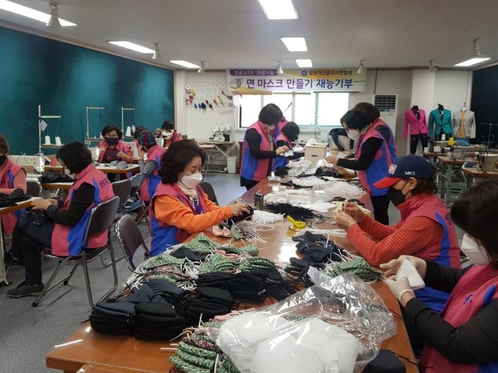 경기 광주시 생활개선연합회가 지난 16~19일 코로나19 장기화로 인해 마스크를 구하기 힘든 취약계층을 위해 '사랑의 면 마스크' 600장을 제작했다. 제작된 마스크는 시로 전량 기부해 농촌지역 노인에게 배부될 예정이다. 사진은 마스크를 만드는 회원들의 모습. (사진제공=광주시청)