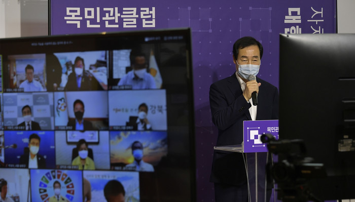 ‘목민관클럽 창립 10주년 기념포럼’이 ‘자치 혁신 10년, 대한민국 희망을 그리다’란 주제로 최근 서울 중구 커뮤니티하우스 마실에서 온라인으로 개최됐다. 사진은 목민관클럽 상임대표인 문석진 서울 서대문구청장이 개회사를 하고 있는 모습. (사진제공=서대문구청)