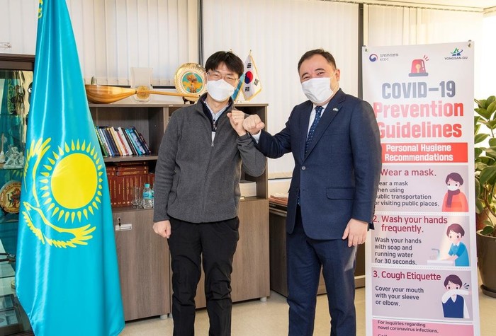 서울 용산구가 지난 10일 재외국민투표를 치른 주한 외국대사관 2곳에 방역물품을 지원했다. 카자흐스탄 대사관은 국회의원 선거를, 키르기스스탄 대사관은 대통령 선거를 치렀다. 사진은 용산구청 공무원(왼쪽)이 카자흐스탄 대사관에 방역 물품을 전달하고 대사관 직원과 주먹인사를 하는 모습. (사진제공=용산구청)