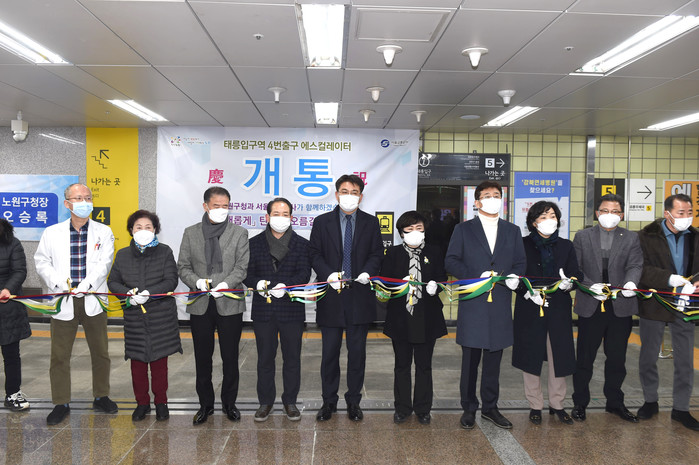 오승록 서울 노원구청장은 지난 3일 지하철 7호선 태릉입구역 지하 1층 4번출구 앞 대합실에서 열린 에스컬레이터 개통식에 참석했다. 이 행사는 2019년 2월부터 시작한 에스컬레이터 공사의 마무리를 기념하기 위한 기념식 및 시승을 위해 마련됐다. 사진은 개통식에서 오 구청장(가운데)이 관계자들과 테이프 커팅을 하고 있는 모습. (사진제공=노원구청)