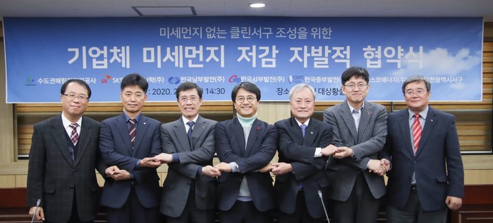 인천 서구가 지난 18일 지역내 미세먼지 핵심 사업장 6곳과 '기업체 미세먼지 저감을 위한 자발적 협약'을 맺었다. 협약에 따라 오는 2022년까지 미세먼지와 대기오염물질을 20% 이상 줄이기로 했다. 사진은 이재현 구청장(가운데)과 관계자들의 기념촬영 모습. (사진제공=서구청)