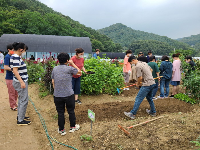 경기 하남시는 최근 이틀간 산곡치유 텃밭 참여자 중 하남시 장애인연합회 회원들을 대상으로 산곡 공공텃밭에서 ‘무·배추 재배교육’을 했다. 참가자들은 무·배추에 관한 교육을 받은 뒤 땅을 갈고, 실제로 텃밭에 작물을 심어보는 체험을 했다. 사진은 참여자들이 땅을 갈고 작물을 심는 모습. (사진제공=하남시청)
