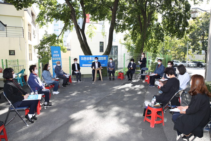 경기 이천시는 6일 공감미팅 '이천은 화목해요'를 창전동 현대아파트, 백사면 한솔아파트 주민들과 소규모로 진행했다. 이천은 화목해요는 매주 화·목요일 지역내 아파트 주민들을 찾아가 대화하며 여론을 청취하는 소통릴레이다. 사진은 엄태준 시장(가운데)이 아파트 주민들과 민원사항에 대해 의견을 나누고 있는 모습. (사진제공=이천시청)