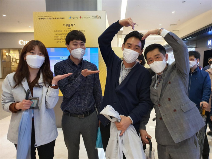 최근 서울 강남구 코엑스에서 열린 ‘코로나19 극복을 위한 함께해요, 희망기부 릴레이 캠페인’에 강남구도시공단 임직원 110명이 참가해 총 158만원을 기부했다. 사진은 기부 후 기념촬영을 하고 있는 강남구도시공단 임직원들의 모습. (사진제공=강남구도시공단)