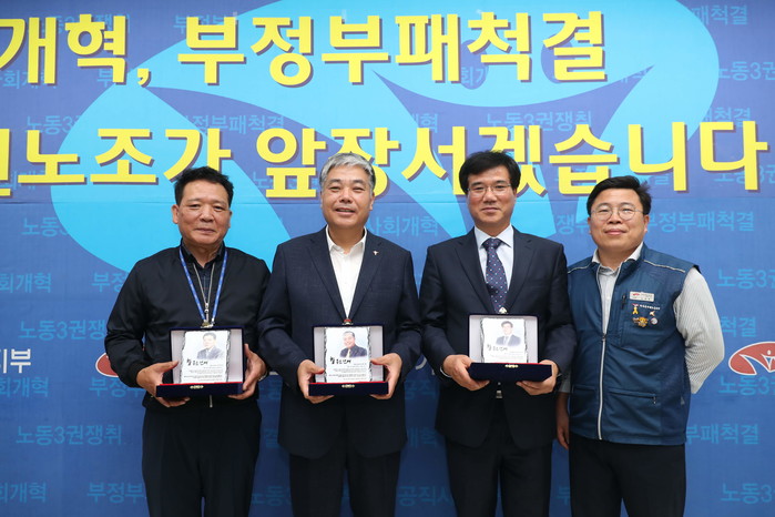 경기 화성시 공직자들이 선정한 ‘2020 베스트 간부공무원’에 김종대 기획조정실장, 김낙주 자치행정국장, 장경의 정책기획과장이 선정됐다. 사진은 상패 수상 후 기념촬영을 하고 있는 베스트 간부공무원 선정자들의 모습. (사진제공=전국공무원노동조합 화성시지부)