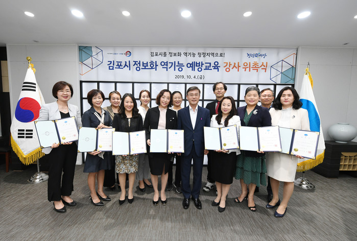 경기 김포시는 최근 시청 소통실에서 ‘정보화 역기능 예방교육’ 강사 위촉식을 개최했다. 이날 정하영 시장이 강사 11명에게 위촉장을 수여했으며, 강사들과 시의 전반에 걸친 사항에 대한 담소를 나눴다. 사진은 정 시장과 강사들이 기념촬영을 하는 모습. (사진제공=김포시청)