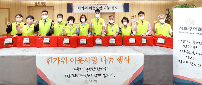 [시민일보 = 이대우 기자] 서울 서초구의회(의장 김안숙)가 최근 본회의장 앞에서 민족 최대 명절인 추석맞이 선물세트 만들기를 실시했다.