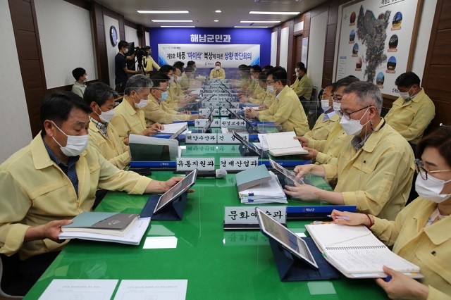 명현관 해남군수도 지난 1일 상황판단회의를 가진 후 실과소장 및 읍면장과 함께 직접 재난취약지역을 둘러보고 민관이 협력해서 단 한건의 태풍 피해도 발생하지 않도록 철저히 대비해 줄 것을 당부했다.