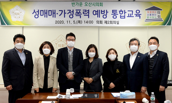 [오산=김정수 기자] 경기 오산시의회가 최근 의회 제2회의실에서 장인수 의장, 김영희 부의장, 김명철·이상복·이성혁·한은경 의원과 의회사무과 직원이 참석한 가운데 ‘성매매·가정폭력 예방 교육’을 실시했다.