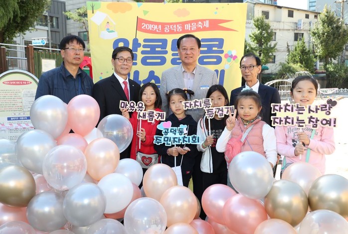 유동균 마포구청장이 9일 공덕초등학교 운동장에서 열린 '알콩달콩 마실축제'에 참석했다. 이날 축제는 인근 주민 등 800여명이 방문해 다양한 체험부스 및 키즈플레이존에 참여했다. 사진은 유 구청장이 어린이들과 기념촬영 하는 모습. (사진제공=마포구청)