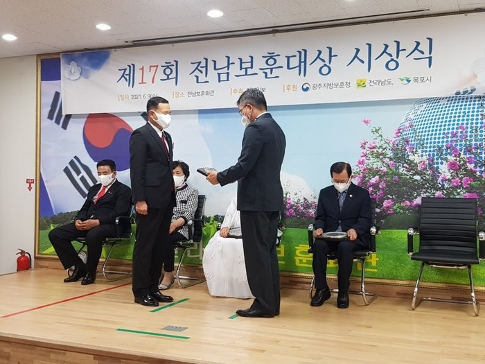 전남일보사가 주최하고 광주지방보훈청·전라남도·목포시가 후원하는 지난 9일 제17회 보훈대상에서 대한민국 무공수훈자회 신안군지회장 김현수(65세·비금면)씨가 특별부문에서 상패와 함께 상금 100만원 및 부상품을 받은 수상의 영예를 안았다.