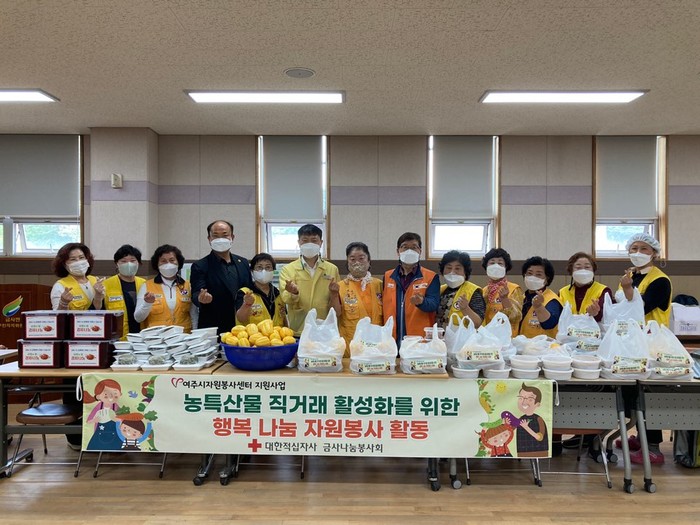 경기 여주시 대한적십자사 금사나눔봉사회는 최근 음식 나눔 자원봉사 활동을 실시해 직접 만든 육개장·밑반찬 등과 금사면 대표 농특산물인 참외를 지역내 저소득 노인 35가구에 전달했다. 사진은 이날 참여한 봉사회원들이 기념촬영을 하는 모습. (사진제공=여주시청)
