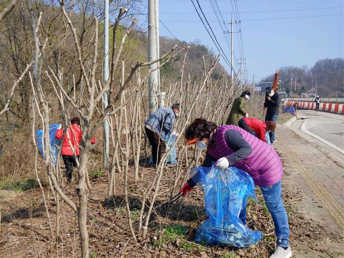 경기 이천시 신둔면 주민자치위원회가 최근 특성화 사업지, 한국도자기술원 이천분원 앞에 식재된 박태기나무 250m 전지작업과 쓰레기수거 등의 환경정화 봉사활동과 함께 면 행정복지센터내 코로나19 방역활동을 전개했다. 사진은 쓰레기 수거 모습. (사진제공=이천시청)