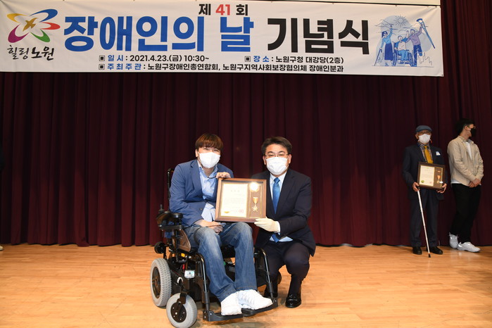오승록 노원구청장은 지난 23일 제41회 장애인의 날 기념식에 참석했다. 사진은 기념식에서 오 구청장(오른쪽)이 표창장 수상자와 기념촬영을 하고 있는 모습. (사진제공=노원구청)