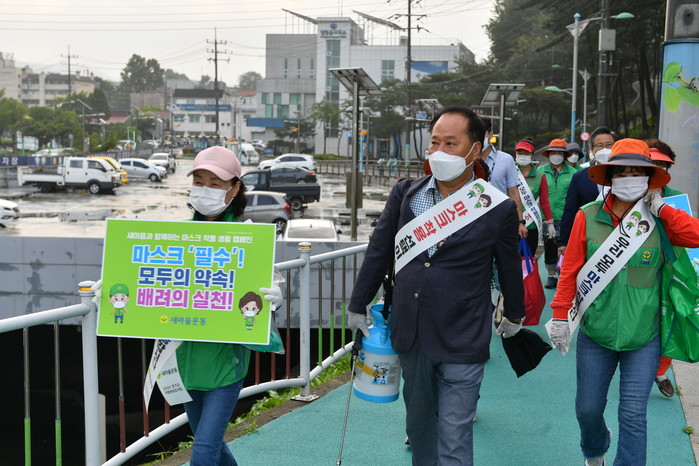 경기 양평군새마을회는 최근 코로나19가 전국적으로 재확산되고 있는 가운데 28일 12개 읍·면 전역 시가지와 다중이용시설 등 일대 방역소독과 함께 '코로나19 예방 마스크 착용 캠페인'을 일제히 전개했다. 사진은 이날 캠페인에 참여한 정동균 군수 및 새마을회원들이 캠페인을 전개하는 모습. (사진제공=양평군청)