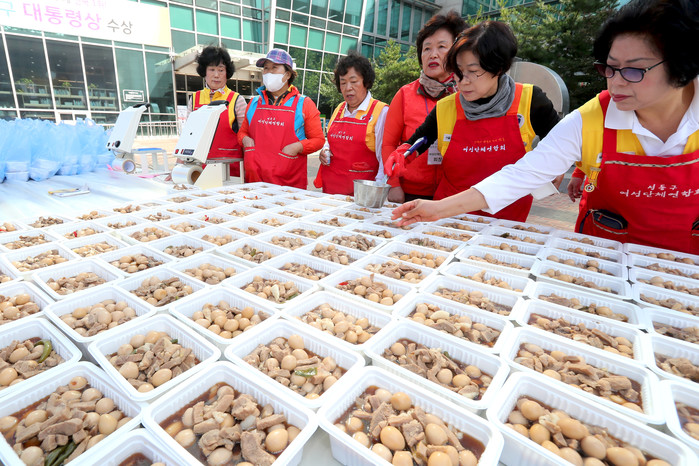 서울 성동구는 16일 구청 앞 광장에서 한부모가정을 위한 밑반찬 나눔행사를 개최하고 장조림, 깍두기, 멸치볶음 등의 밑반찬을 함께 만들었다. 이날 만든 밑반찬은 한부모가정 255가구에 전달됐다. 사진은 장조림을 포장하고 있는 모습. (사진제공=성동구청)