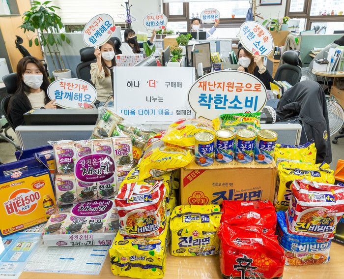 서울 양천구가 각 동 및 부서에 나눔 박스를 비치해 오는 25일까지 직원들을 대상으로 긴급재난지원금으로 구입한 기증품을 모아 푸드뱅크마켓센터에 기부하는 '마음 더하기 마음 착한소비 캠페인'을 펼친다. 사진은 공무원들이 재난지원금으로 구매한 식료품들과 함께 캠페인 홍보를 하며 기념촬영을 하고 있는 모습. (사진제공=양천구청)
