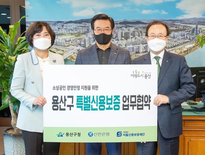 서울 용산구는 23일 신한은행·서울신용보증재단과 담보력이 부족한 소기업·소상공인을 지원하기 위한 ‘특별신용보증’ 업무협약을 맺었다. 이를 통해 구가 추천한 기업을 대상으로 재단이 심사를 거쳐 신용보증을 지원하며 한도는 120억원이다. 사진은 이날 협약식에서 성장현 구청장(가운데)과 관계자들이 기념촬영을 하는 모습. (사진제공=용산구청)