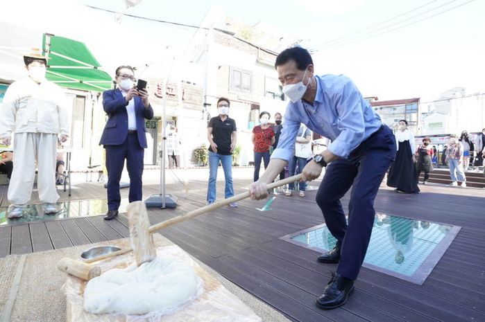 이승로 서울 성북구청장이 추석을 앞두고 15일 부인 임명숙씨와 정릉시장을 방문해 식재료 등을 구입하며 전통시장 이용을 독려했다. 사진은 정릉시장에서 이 구청장이 떡메치기 체험 행사에 참여한 모습. (사진제공=성북구청)
