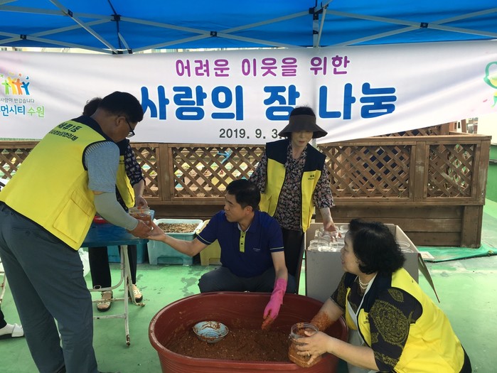 경기 수원시 권선구 세류1동 지역사회보장협의체는 3일 세류1동 행정복지센터에서 생활이 어려운 이웃을 위해 올해 초부터 정성껏 담은 전통 장(된장·간장 각 100병) 나눔 행사를 진행했다. 사진은 협의체 관계자들이 장을 병에 담고 있는 모습. (사진제공=수원시청)