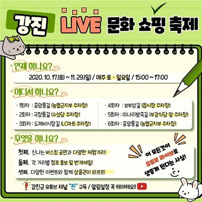 ‘라이브 문화쇼핑 축제’는 중앙통길 농협군지부 주차장에서 시작해 극장통길 수성당 옆 주차장, 도깨비시장길 LC마트 앞 주차장, 보부상길 읍시장 주차장, 미나리방죽길 남문 주차장 순으로 5개 거리를 순회하며 진행되며, 강진군 유튜브 채널을 구독하면 라이브 방송 시 알림이 스마트폰에 전달돼 라이브 방송을 놓치지 않고 시청할 수 있다.
