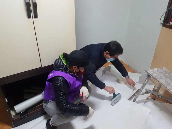 중랑구 면목2동 주민센터는 최근 고독사 위험가구를 방문해 노후된 벽지와 장판·전등을 교체하고 집안 집기정리 및 청소를 진행했다. 사진은 이날 행복나누리협의체 회원들이 대상자의 집 도배를 하고 있는 모습. (사진제공=중랑구청)