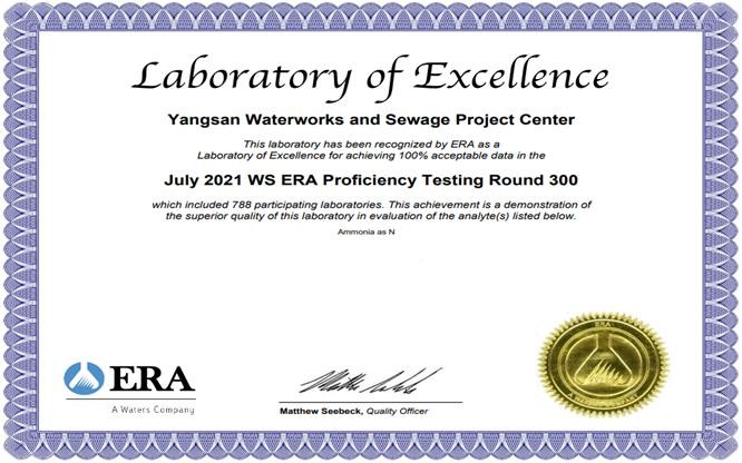 양산시 상하수도사업소 ‘먹는물 수질검사기관’은 국제공인시험기관 미국 환경자원협회(ERA)에서 주관하는 먹는물 분야 국제숙련도에 참가해 ‘만족’ 판정을 받아 5년 연속 최우수실험실(Laboratory of Excellence)로 선정됐다.