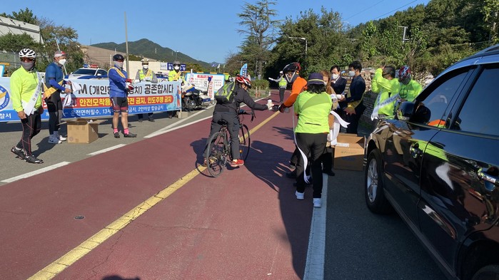 양산경찰서(서장 정성학)는 지난 17일 주말을 맞아 개인형 이동장치 및 자전거 이용객이 많은 양산시 물금취수장 앞에서‘자전거길 교통안전 캠페인’을 실시했다. 이 자리에는 양산경찰서장, 한옥문 도의원, 곽종포 시의원, 양산시 체육회(회장 정상열), 양산시 자전거연맹(회장 김성호), 양산경찰서 자전거 동호회, 교통관리계 직원 등 30여명이 함께했다.